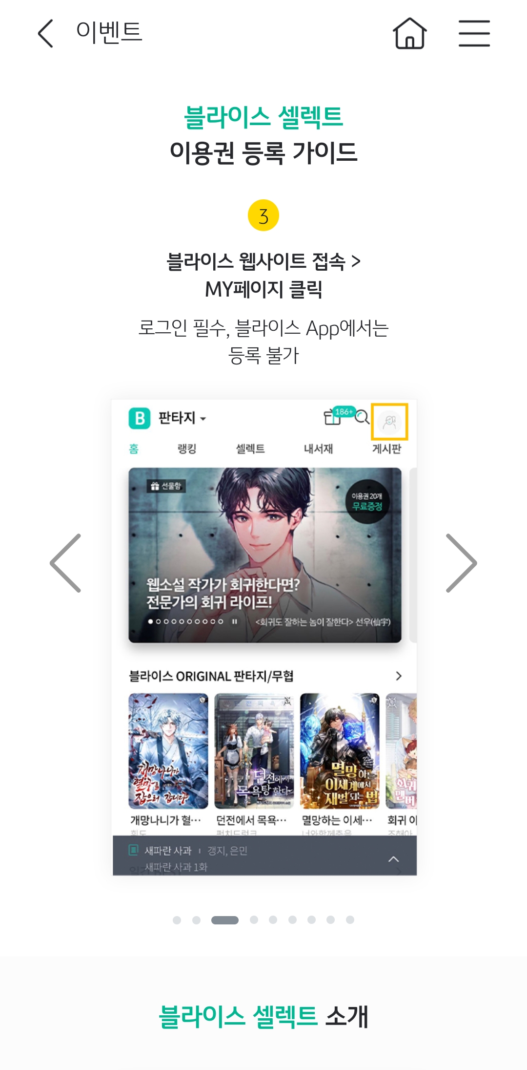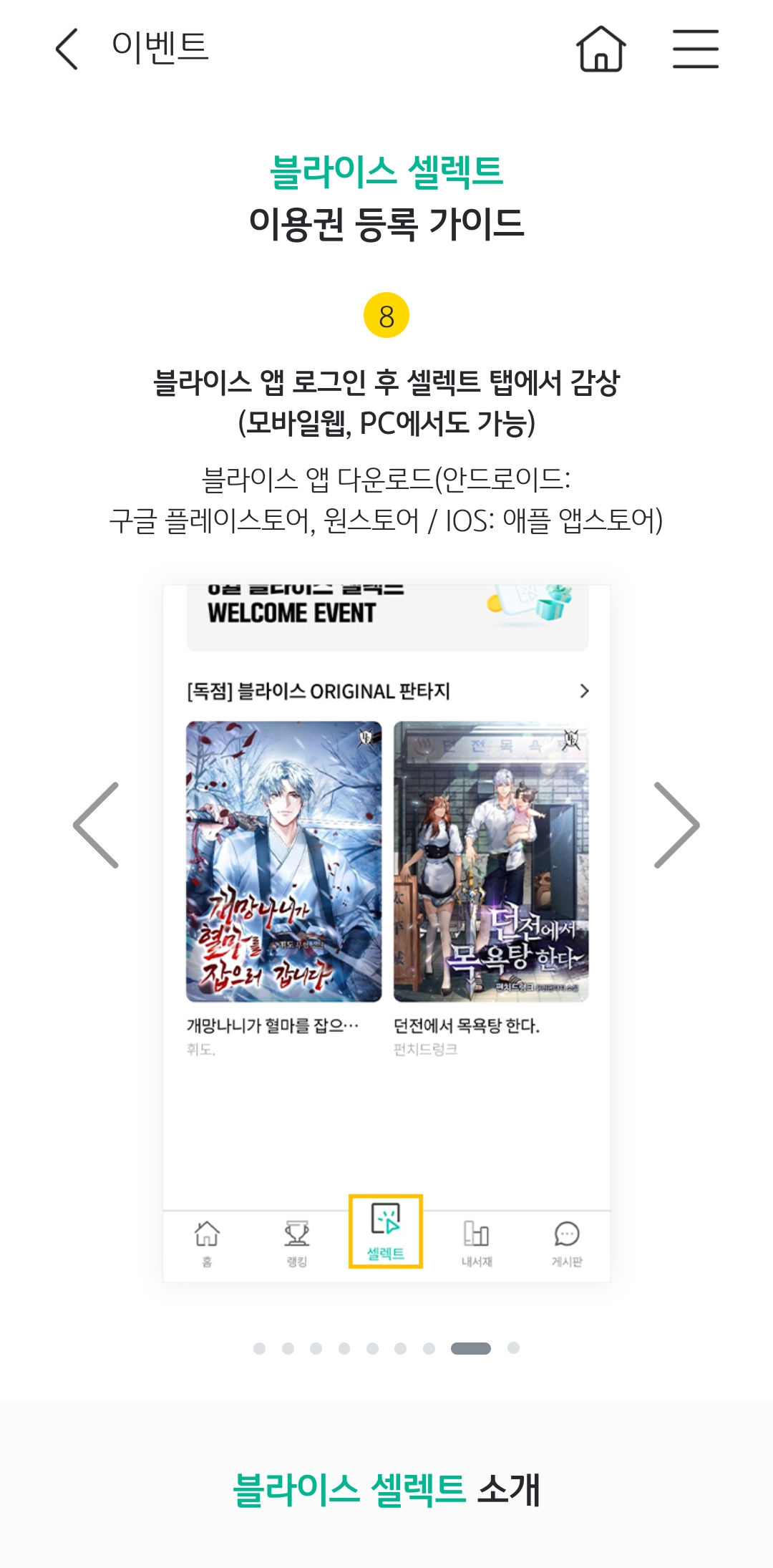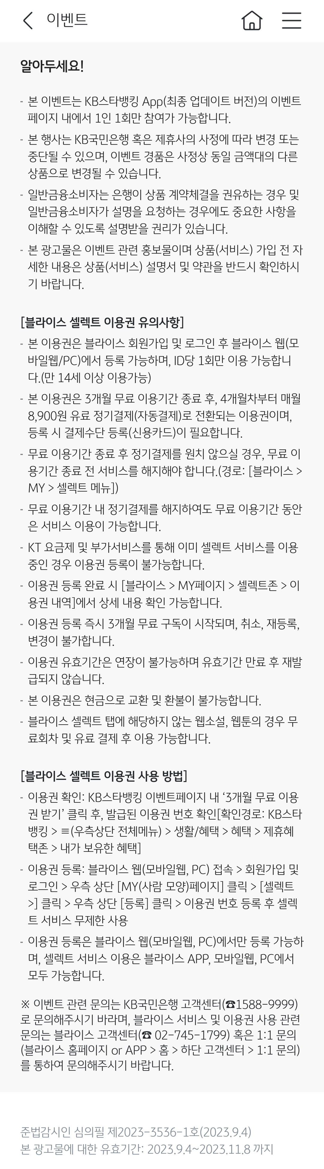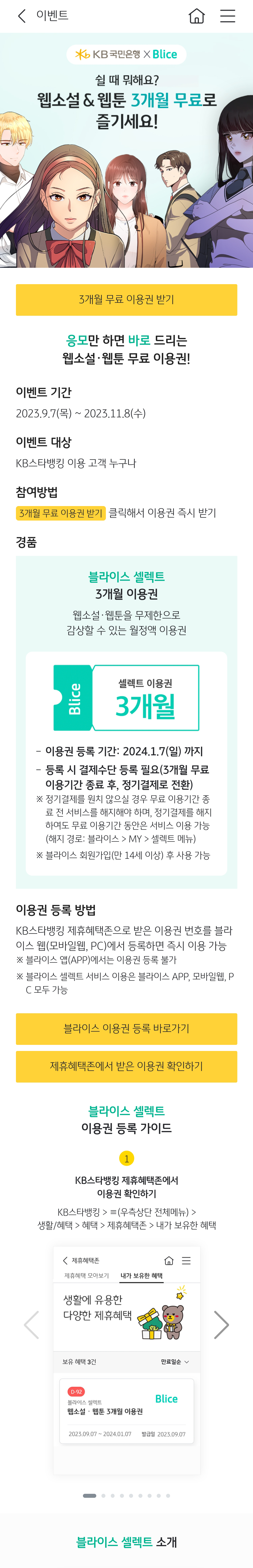 KB국민은행 X 블라이스 셀렉트 웹툰 웹소설 3개월 무료 이용권 등록방법입니다