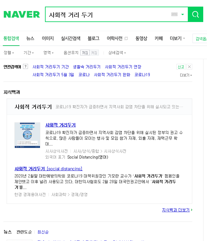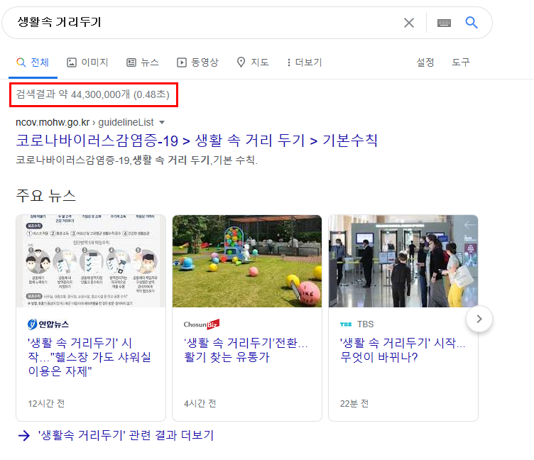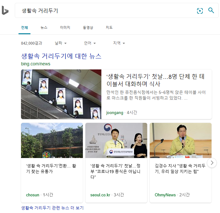 "생활속 거리두기" 라는 키워드로 검색했을때