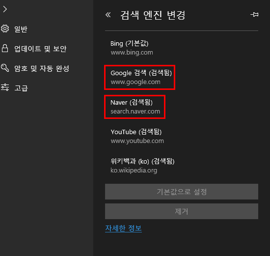 기본값 Bing에서 원하시는 검색엔진을 선택해 주고 "기본값으로 설정"을 눌러 줍니다.