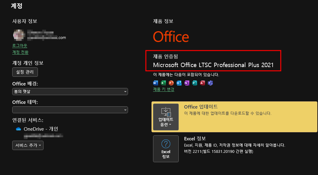 그럼 큰 붉은색 Office 글씨 아래 현재 버전이 표시가 됩니다.