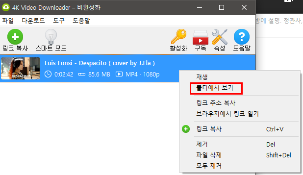 다운로드된 영상(파란 부분)에 우클릭 > 폴더에서 보기를 클릭하시면