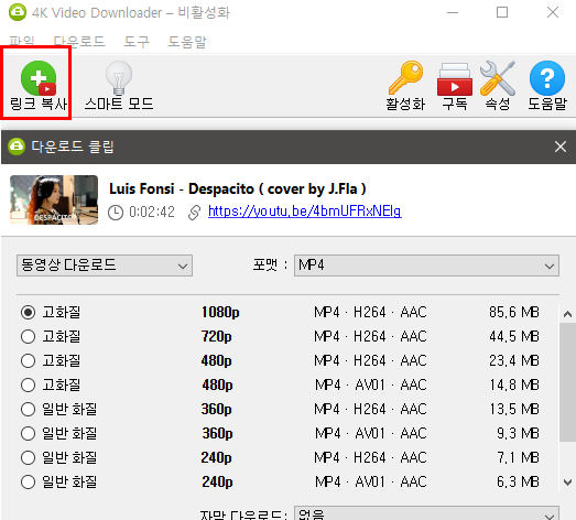 다시 4K Video Downloader로 돌아와서 +링크 복사를 누르게 되면