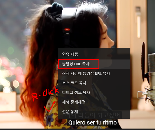 동영상 아무 화면에서 우클릭한 후 "동영상 URL 복사"를 눌러 클립보드에 저장합니다.